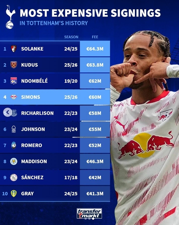 热刺最贵引援:索兰克6430万欧标王,哈维-西蒙斯6000万欧第四