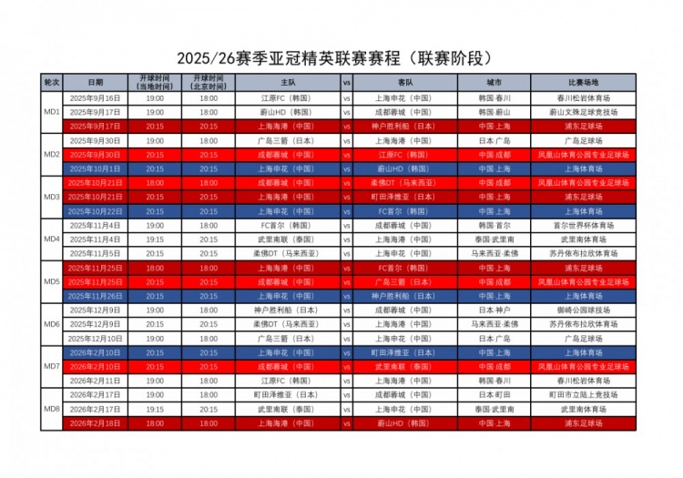 足协汇总中超4队亚冠赛程:精英联赛联赛阶段9月16日-2月18日进行