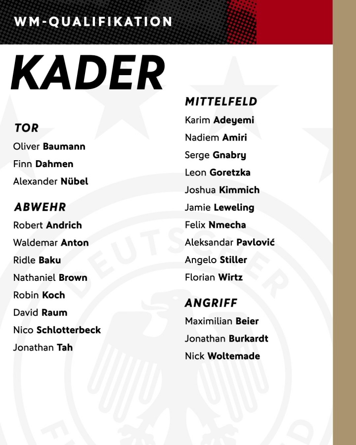 德国名单:沃尔特马德、维尔茨领衔 基米希、努贝尔在列 萨内落选