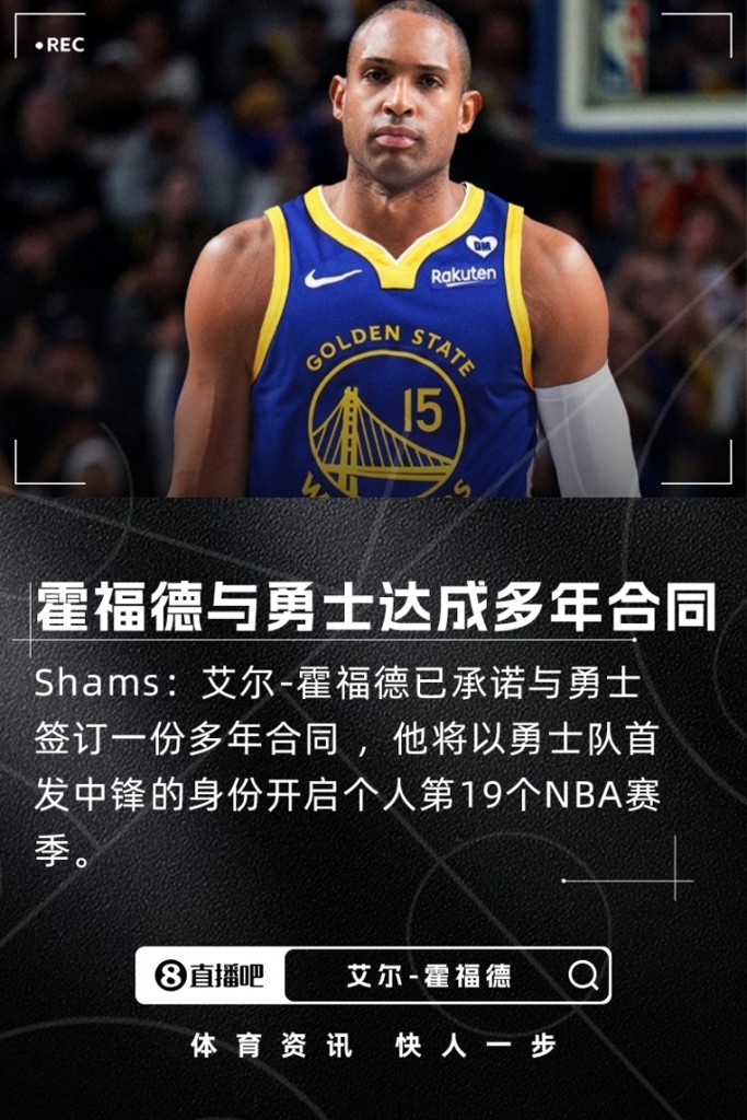 09月29日讯 据ESPN名记Shams报道,艾尔-霍福德已承诺与勇士签订一份多年合同 ,他将以勇士队首发中锋的身份开启个人第19个NBA赛季。