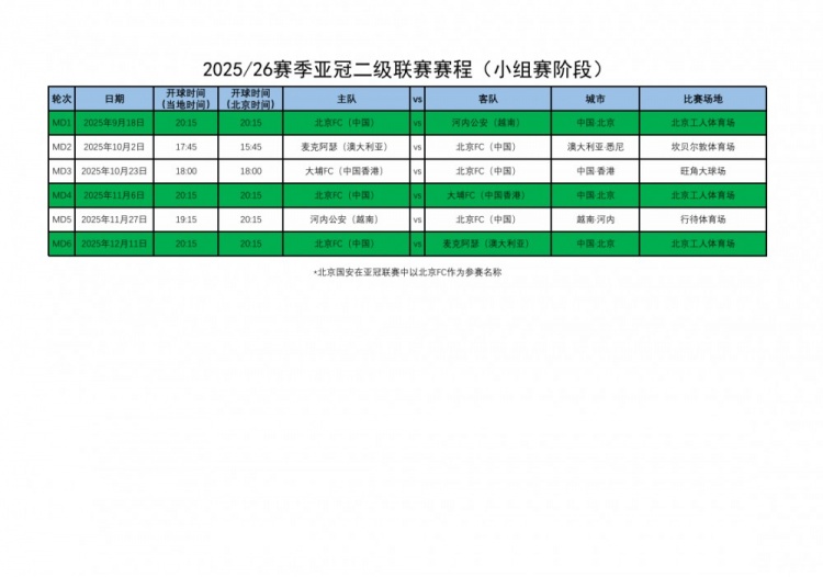 附国安亚冠二级联赛(小组赛阶段)赛程: